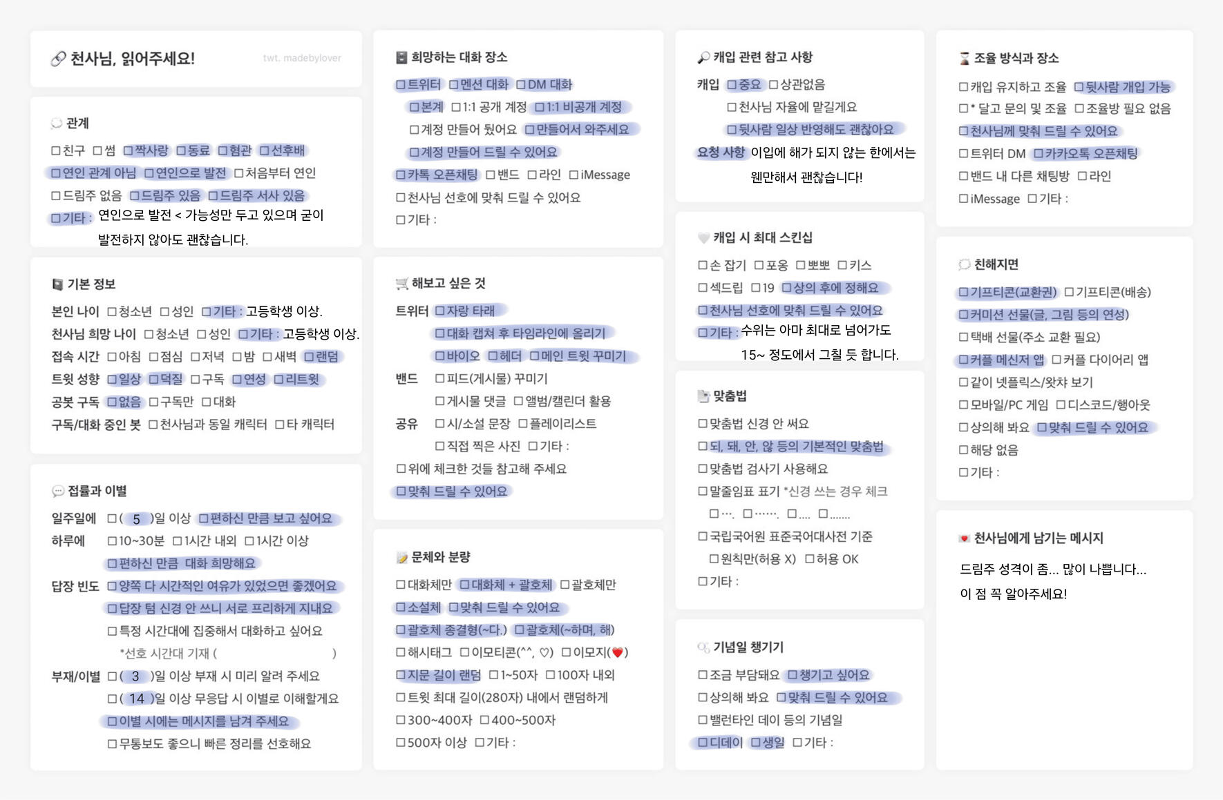 앞서 제가 트친 분이 제 천사님이라는 것을 알면 몰입이 잘 깨지므로 트친 분은 트친으로만 만나기를 선호합니다.토미오카 기유 라는 캐릭터에 대한 애정이 많이 깊습니다. 특유의 말투나 행동, 그리고 성격을 잘 이해하고 이입해주실 수 있는 분을 원합니다. 잦은 것은 좋아하지 않으나 가끔 나는 캐붕 정도는 괜찮으니 너무 깐깐하다 생각하지는 말아주세요.천사님은 최소 고등학생 이상에서 성인의 생물학적 여성 분이었으면 좋겠습니다. 저는 이미 그 조건을 충족하고 있습니다. 제가 개인적으로 답장 텀이 빠르면 1~2분, 늦어도 2시간 안에는 답장을 하는 편이라 답장 시간대가 조금은 여유로우신 분을 선호합니다. 최대 이틀에서 사흘까지는 기다려 드릴 수 있습니다. 트위터에서 인용, 댓글, 사진을 사용하여 올리시는 것도 정말 좋아합니다. 천사님 개인 독백 역시 정말 좋아해요. 독백은 제가 받고 답을 올릴 수도 있습니다.천사님께 오너는 제가 유일하길 바랍니다. 저 역시도 천사님께 최대로 집중할 수 있도록 다른 천사님은 모시지 않을 생각입니다. 하지만 천사님과의 합의 하에 렌고쿠 쿄쥬로 천사님까지는 모셔볼 의향도 있습니다. 부디 오실 때에 어느 쪽이 편하신지 알려주세요. 참고로 공봇을 구동 중이시라면 공봇은 제외입니다. 공봇 페어는 신경쓰지 않으니 그쪽은 걱정하지 않으셔도 됩니다. 천사님으로써의 오너만 저를 유일시 해주시면 됩니다.